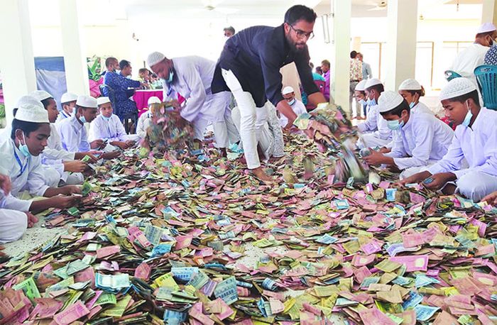 সকাল সাড়ে ৯টার দিকে বস্তাগুলো মসজিদের দ্বিতীয় তলায় নিয়ে যাওয়া হয়। erপর মেঝেতে ঢেলে শুরু হয় গণনার কাজ।