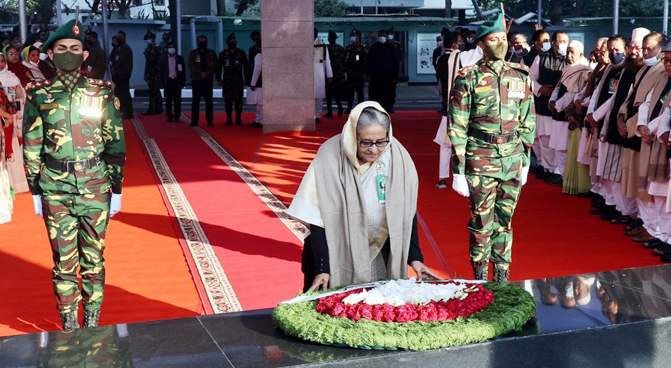 বঙ্গবন্ধুর প্রতিকৃতিতে শেখ হাসিনার শ্রদ্ধা