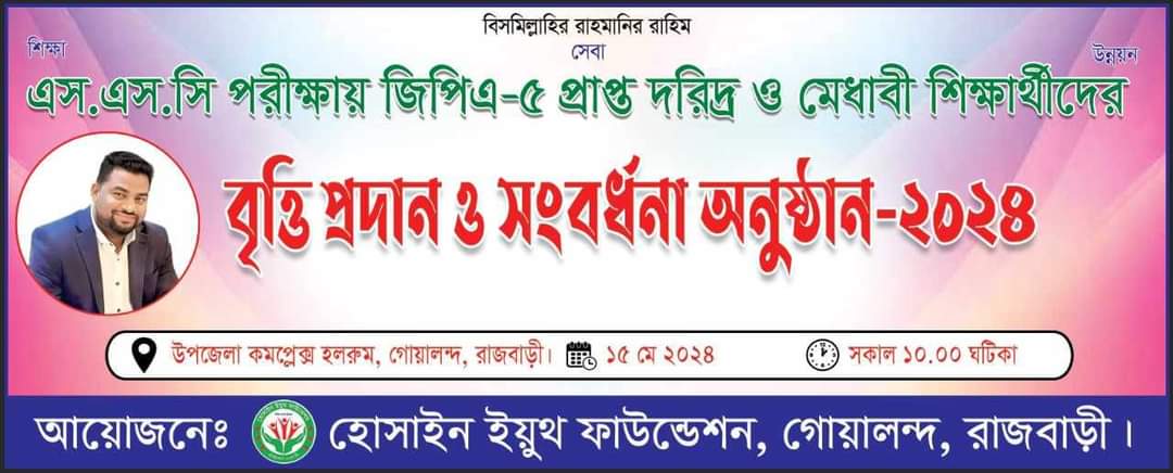 ১৫ ই মে বুধবার সকালে রাজবাড়ীর গোয়ালন্দ উপজেলা পরিষদ হলরুমে হোসাইন ইয়ুথ ফাউন্ডেশন এর প্রতিষ্ঠাতা ও প্রধান উপদেষ্টা সৌদি প্রবাসী মোহাম্মাদ হোসাইন এর পক্ষ থেকে গোয়ালন্দ উপজেলার এসএসসি পরীক্ষায় জিপিএ-৫ প্রাপ্ত ১৩ জন দরিদ্র ও শিক্ষাবৃত্তি নগত ১০ হাজার টাকা ও সংবর্ধনা দেয়া হয়েছে৷