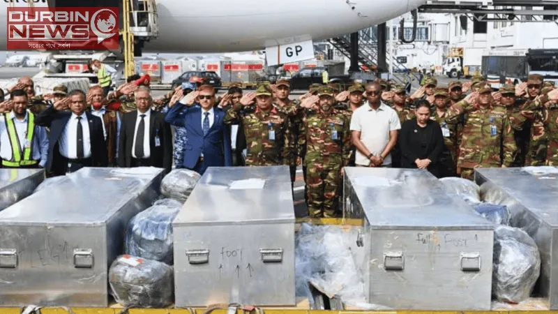 সুদানে জাতিসংঘ শান্তিরক্ষা মিশনের ঘাঁটিতে সন্ত্রাসী ড্রোন হামলায় শহীদ হওয়া ছয় বাংলাদেশি শান্তিরক্ষীর মরদেহ দেশে পৌঁছেছে। শনিবার (২০ ডিসেম্বর) সকাল ১১টা ৫ মিনিটে এমিরেটস এয়ারলাইন্সের একটি ফ্লাইটে তাদের মরদেহ হযরত শাহজালাল আন্তর্জাতিক বিমানবন্দরে অবতরণ করে।