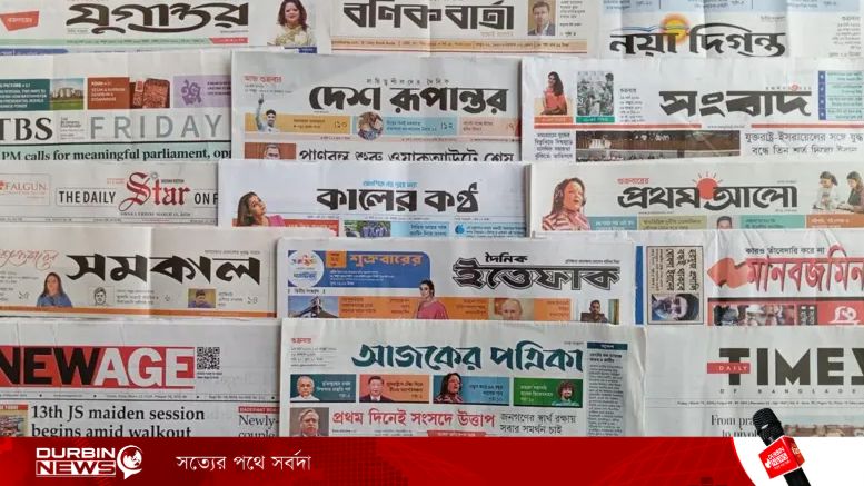 ঢাকা থেকে প্রকাশিত বিভিন্ন জাতীয় দৈনিক পত্রিকার শিরোনামগুলোতে গুরুত্ব পেয়েছে দেশের জ্বালানি সরবরাহ পরিস্থিতি, ত্রয়োদশ জাতীয় সংসদের প্রথম অধিবেশনের উত্তাপ, আন্তর্জাতিক বাণিজ্য তদন্ত এবং মধ্যপ্রাচ্যের যুদ্ধ পরিস্থিতি- আজকের পত্রিকাগুলোর শিরোনামে উঠে এসেছে এসব বিষয়।