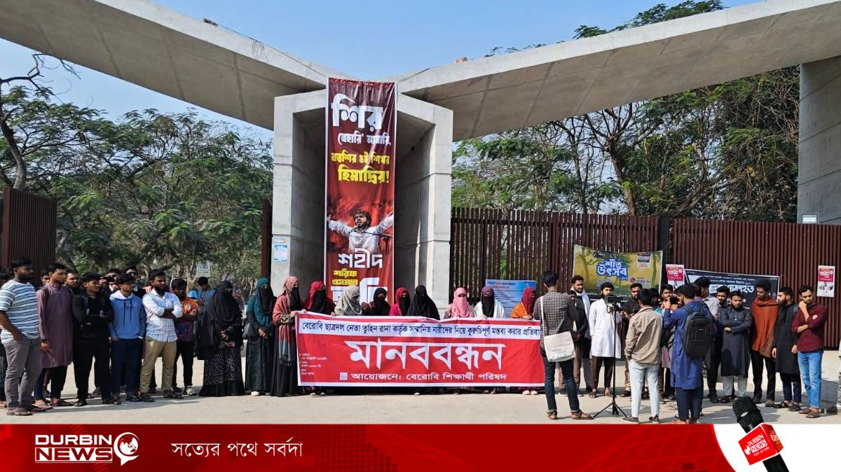 বোরখা, হিজাব ও নিকাব পরিহিত নারীদের নিয়ে কুরুচিপূর্ণ ও অবমাননাকর মন্তব্যের প্রতিবাদে বেগম রোকেয়া বিশ্ববিদ্যালয়, রংপুরে (বেরোবি) মানববন্ধন করেছেন শিক্ষার্থীরা। বুধবার (২৮ জানুয়ারি) সকাল সাড়ে ১০টায় বিশ্ববিদ্যালয়ের প্রধান ফটকের সামনে বেরোবি শিক্ষার্থী পরিষদের ব্যানারে এ মানববন্ধন অনুষ্ঠিত হয়।