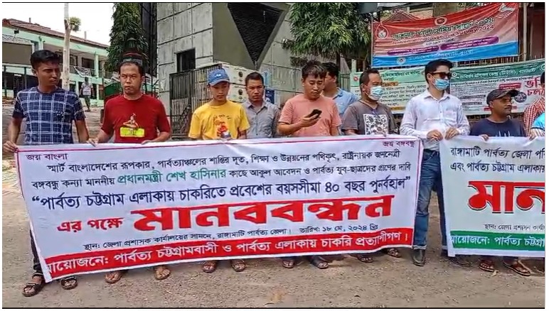 পার্বত্য চট্টগ্রামে চাকরিতে প্রবেশের বয়সসীমা ৪০ পূর্ণবহালের দাবিতে রাঙামাটিতে মানববন্ধন