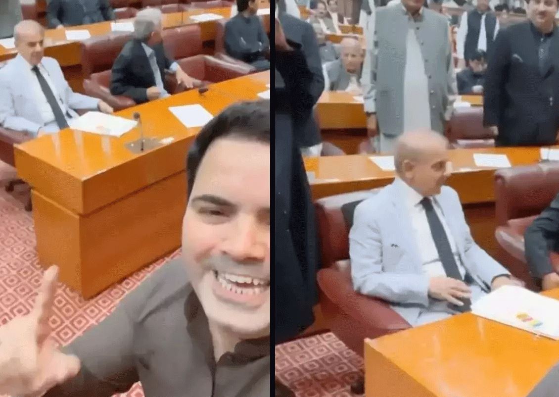 এ ভিডিওতে ফাহিম খানকে বলতে শোনা যায়, এখন আমি জাতীয় পরিষদে রয়েছি। আমি এখন সকলের সঙ্গে একজন আন্তর্জাতিক ভিক্ষুকের পরিচয় করিয়ে দিব। এটা বলেই তিনি মোবাইল ফোনের ক্যামেরা শাহবাজ শরিফের দিকে তাক করান।
