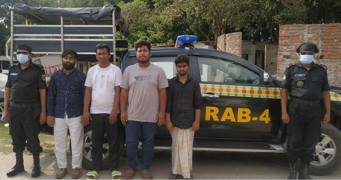 গ্রেপ্তাকৃতরা হলো- রনি ভূইয়া (২০), বাহদুর মৃধা (২৭), তালুকদার মাহমুদুল হাসান (৩২) ও তালুকদার ওয়ালিউল ইসলাম শুভ (২২)।