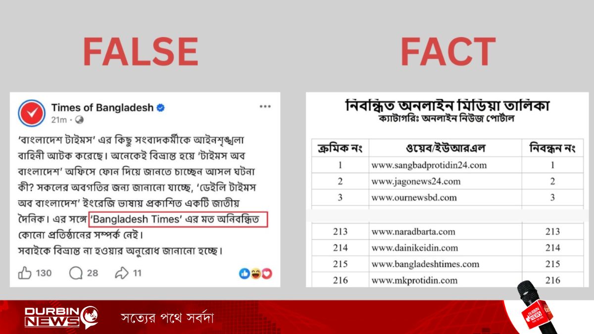 সংবাদকর্মী আটকের ঘটনায় ‘টাইমস অব বাংলাদেশ’ বিভ্রান্তিকর পোস্ট