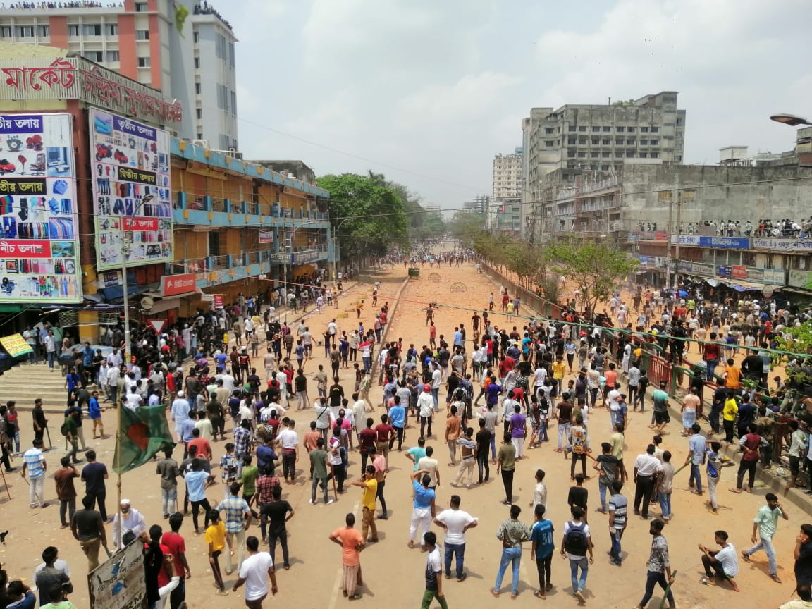 সরেজমিনে দেখা যায়, শিক্ষার্থীরা সড়কে অবস্থান নিলেও ব্যবসায়ীরা ভবনের ওপর থেকে শিক্ষার্থীদের উদ্দেশ্য করে ইট-পাটকেল নিক্ষেপ করছে।