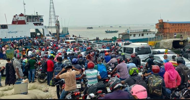 মুন্সিগঞ্জের শিমুলিয়া ও মানিকগঞ্জের পাটুরিয়া ফেরিঘাট এলাকায় পদ্মা পাড়ি দিতে ঘাটে আসছে হাজার হাজার মানুষ।