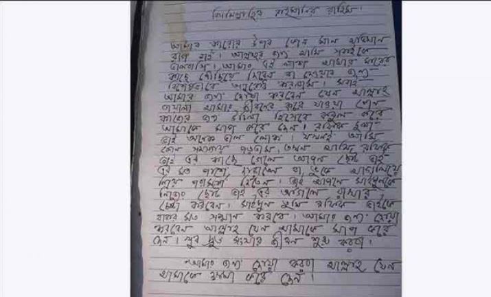 মরদেহের পাশে পাওয়া চিরকুটে লেখা ছিল, ‘আমার কারও ওপর কোনও মান-অভিমান, রাগ নেই। আল্লাহর জন্য আমি সবাইকে ভালোবাসি। আমার এই লাশ আমার মায়ের কাছে পৌঁছে দেবেন বা দেওয়ার জন্য বিশেষভাবে অনুরোধ রইলো। সবাই আমার জন্য দোয়া করবেন, যেন আল্লাহ আমার জীবনে করে যাওয়া কোনও কাজের উছিলা হিসেবে কবুল করে আমাকে মাফ করে দেন।’