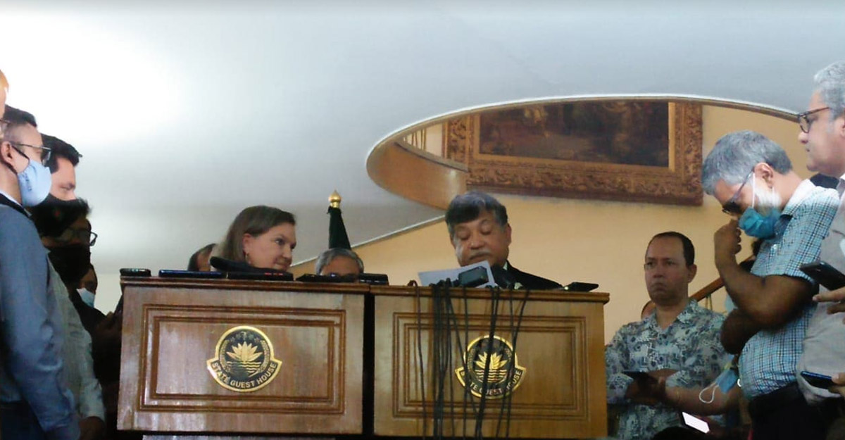 সকালে পররাষ্ট্র সচিব মাসুদ বিন মোমেনের সঙ্গে যুক্তরাষ্ট্রের পররাষ্ট্র দফতরের রাজনীতি বিষয়ক আন্ডার সেক্রেটারি ভিক্টোরিয়া নুল্যান্ড সংলাপে বসেন।