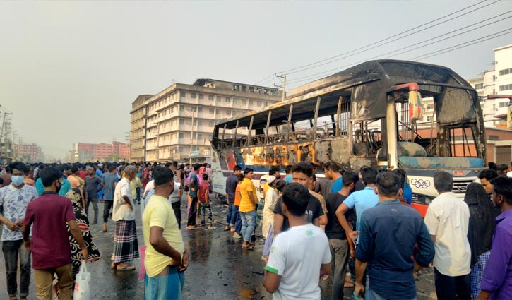 শ্রমিকের মৃত্যুর গুজবে গাজীপুরে বাসে আগুন, সড়ক অবরোধ