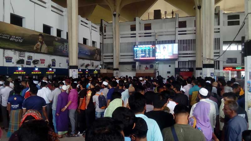 বুধবার সকালে সরেজমিনে কমলাপুর রেল স্টেশনে গিয়ে দেখা যায়, টেনের টিকেটের জন্য দাঁড়ানোর যাত্রীদের লাইন চলে গেছে স্টেশনের বাইরে পর্যন্ত। এই গরমে ঘেমে-নেয়ে একাকার অবস্থা তাদের। দীর্ঘক্ষণ লাইনে দাঁড়ানোর কারণে অনেকে মেজাজ হারিয়ে চিৎকার-চেঁচামেচি করছেন।