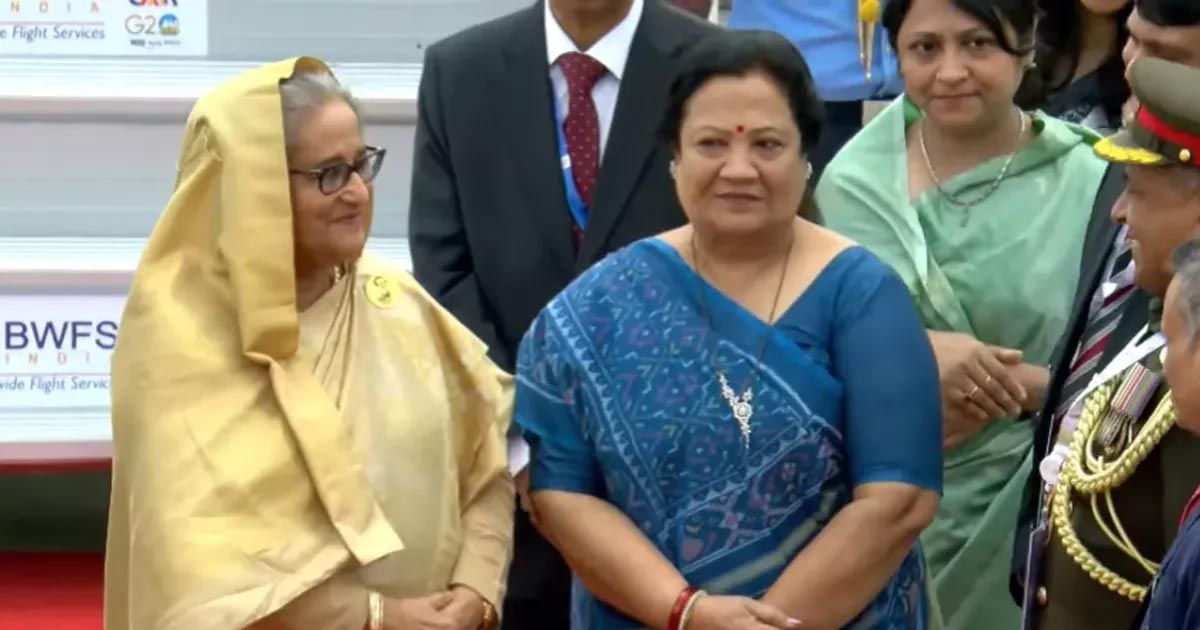 শুক্রবার (৮ সেপ্টেম্বর) স্থানীয় সময় ১২টা ৪০ মিনিটে ইন্দিরা গান্ধী আন্তর্জাতিক বিমানবন্দরে অবতরণ করে প্রধানমন্ত্রী শেখ হাসিনা ও তার সফরসঙ্গীদের বহনকারী বিমান বাংলাদেশে এয়ারলাইনসের উড়োজাহাজটি। তিনি সেখানে পৌঁছালে লাল গালিচায় তাকে স্বাগত জানানো হয়েছে। বাংলাদেশের প্রধানমন্ত্রীকে অভ্যর্থনা জানান ভারতের রেল ও বস্ত্র প্রতিমন্ত্রী দর্শনা বিক্রম জারদোশ। বিমানবন্দরে একটি সাংস্কৃতিক দল স্বাগত নৃত্যও পরিবেশন করে এ সময়।