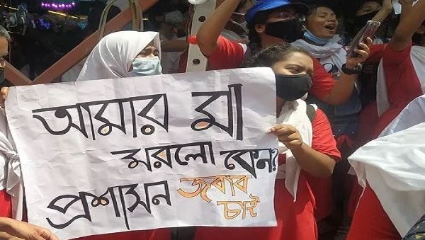 এ সময় রাস্তা অবরোধ করে শিক্ষার্থীরা ‘আমার মা মরল কেন বিচার চাই, আর কত নিরীহ প্রাণ রাস্তায় ঝরবে, উই ওয়ান্ট জাস্টিস; আমার মা মরল কেন প্রশাসন জবাব চাই’- এরকম নানা স্লোগান দিতে থাকেন।