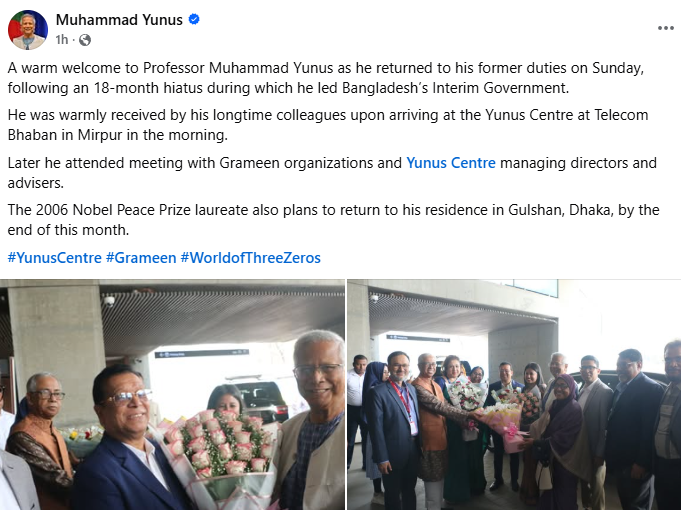 সকালে মিরপুরের টেলিকম ভবনে অবস্থিত ইউনূস সেন্টারে পৌঁছালে দীর্ঘদিনের সহকর্মীরা তাকে উষ্ণ অভ্যর্থনা জানান। দায়িত্ব পালনের বিরতির পর আবারও কর্মস্থলে ফিরে সহকর্মীদের সঙ্গে সৌহার্দ্যপূর্ণ পরিবেশে সময় কাটান তিনি।