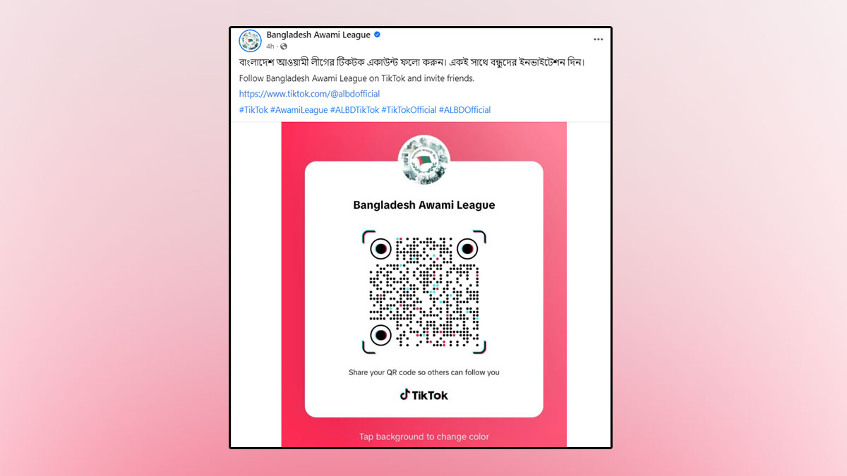 ফেসবুক পোস্টটিতে আওয়ামী লীগের টিকটক অ্যাকাউন্টের লিংক যুক্ত করা হয়েছে। এছাড়া কিউআর কোডও দেয়া হয়েছে।