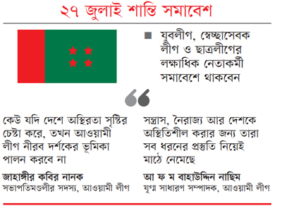 আগামী ২৭ জুলাই দুপুরে রাজধানীর জাতীয় মসজিদ বায়তুল মোকাররমের দক্ষিণ গেটে যুবলীগ, স্বেচ্ছাসেবক লীগ ও ছাত্রলীগ যৌথভাবে এই শান্তি সমাবেশের আয়োজন করছে। এ সমাবেশে প্রধান অতিথি থাকবেন আওয়ামী লীগের সাধারণ সম্পাদক ওবায়দুল কাদের।
