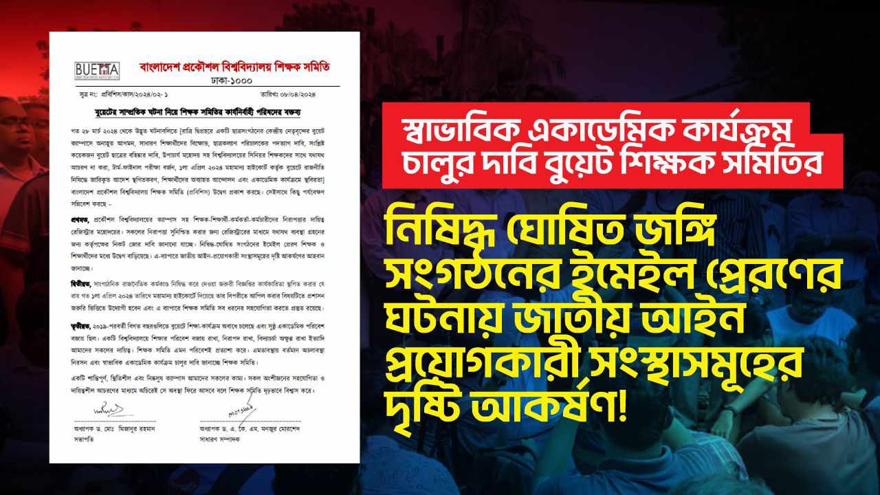 বিবৃতিতে বুয়েট শিক্ষার্থীদের কাছে নিষিদ্ধ ঘোষিত সংগঠনের ইমেইল প্রেরণের বিষয়ে উদ্বেগ প্রকাশ করা হয়। সেইসঙ্গে এ ব্যাপারে জাতীয় আইন প্রয়োগকারী সংস্থাসমূহের দৃষ্টি আকর্ষণের আহ্বান জানানো হয়।