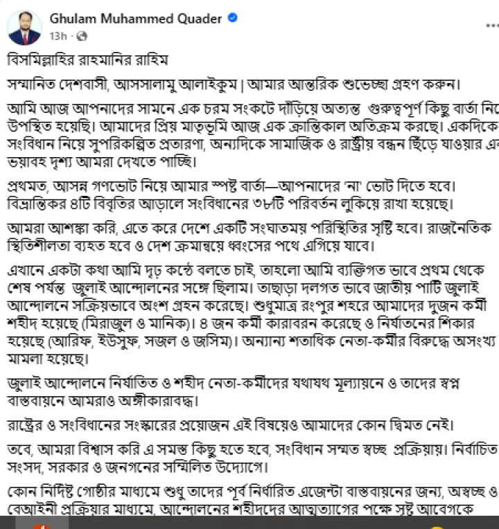 গণভোটে ‘না’ ভোট দেওয়ার আহ্বান জানিয়ে জি এম কাদের বলেন, ‘কোন নির্দিষ্ট গোষ্ঠীর মাধ্যমে শুধু তাদের পূর্ব নির্ধারিত এজেন্ডা বাস্তবায়নের জন্য, অস্বচ্ছ ও বেআইনী প্রক্রিয়ার মাধ্যমে, আন্দোলনের শহীদদের আত্মত্যাগের পক্ষে সৃষ্ট আবেগকে কাজে লাগিয়ে, যে ধরনের সংস্কার প্রস্তাব করা হয়েছে, তা আমাদের কাছে গ্রহনযোগ্য নয়।