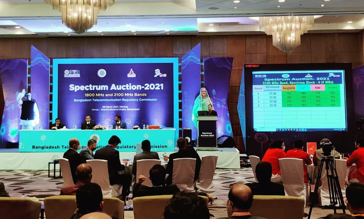 দেশের সব মোবাইল অপারেটর প্রতিনিধিদের সক্রিয় অংশগ্রহণে ২ দশমিক ৩ গিগাহার্জ ব্যান্ডের বরাদ্দযোগ্য ১০০ মেগাহার্জ (১০ মেগাহার্জের ১০টি ব্লক) এবং ২ দশমিক ৬ গিগাহার্জ ব্যান্ডের বরাদ্দযোগ্য ১২০ মেগাহার্জ (১০ মেগাহার্জের ১২টি ব্লক) এই তরঙ্গ নিলাম অনুষ্ঠিত হয়।