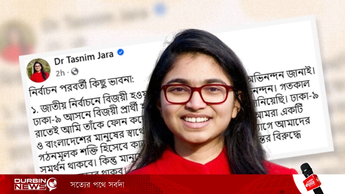 জাতীয় নাগরিক পার্টি (এনসিপি) থেকে সরে দাঁড়িয়ে আসন্ন জাতীয় সংসদ নির্বাচনে স্বতন্ত্র প্রার্থী হিসেবে অংশ নেওয়ার ঘোষণা দিয়েছেন দলটির সিনিয়র যুগ্ম সদস্য সচিব ডা. তাসনিম জারা। শনিবার সন্ধ্যায় নিজের ভেরিফায়েড ফেসবুক অ্যাকাউন্টে দেওয়া এক আবেগঘন পোস্টে তিনি এই সি
